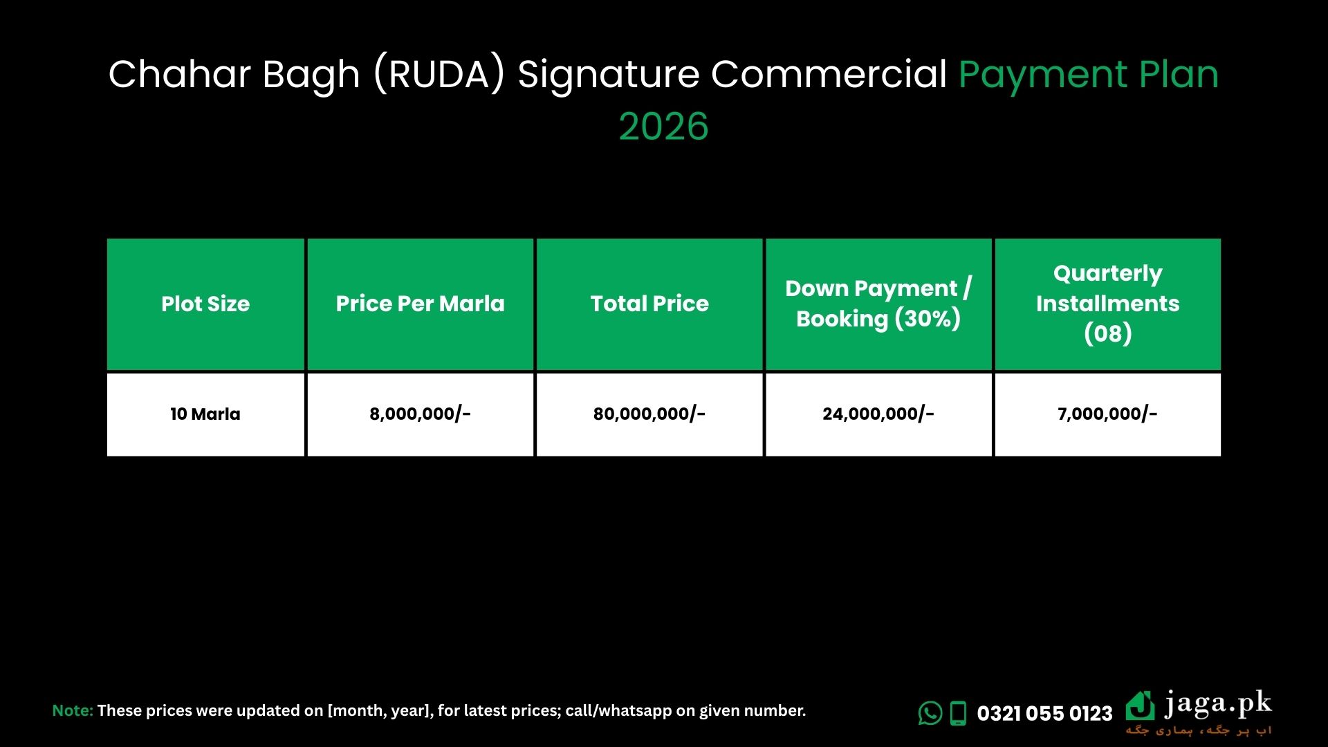| Plot Size | Price Per Marla | Total Price | Down Payment / Booking (30%) | Quarterly Installments (08) |