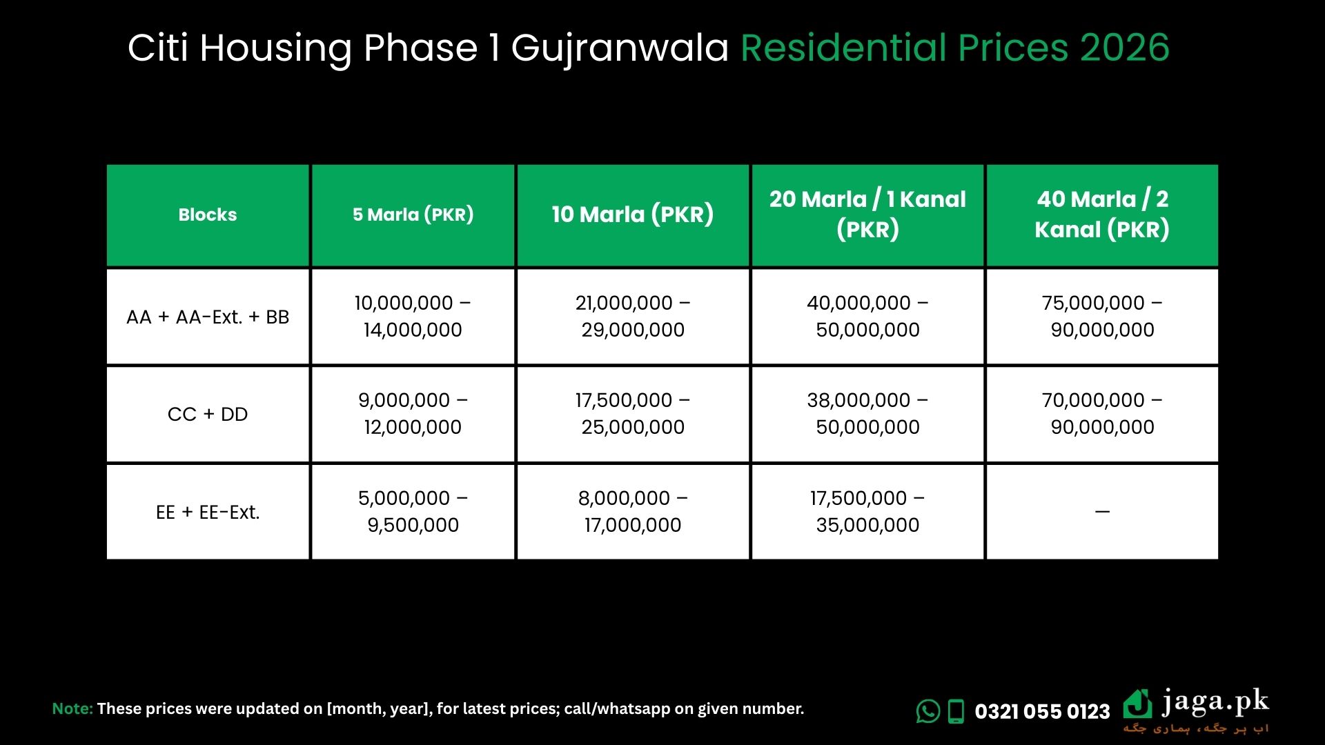 | Blocks | 5 Marla (PKR) | 10 Marla (PKR) | 20 Marla / 1 Kanal (PKR) | 40 Marla / 2 Kanal (PKR) |