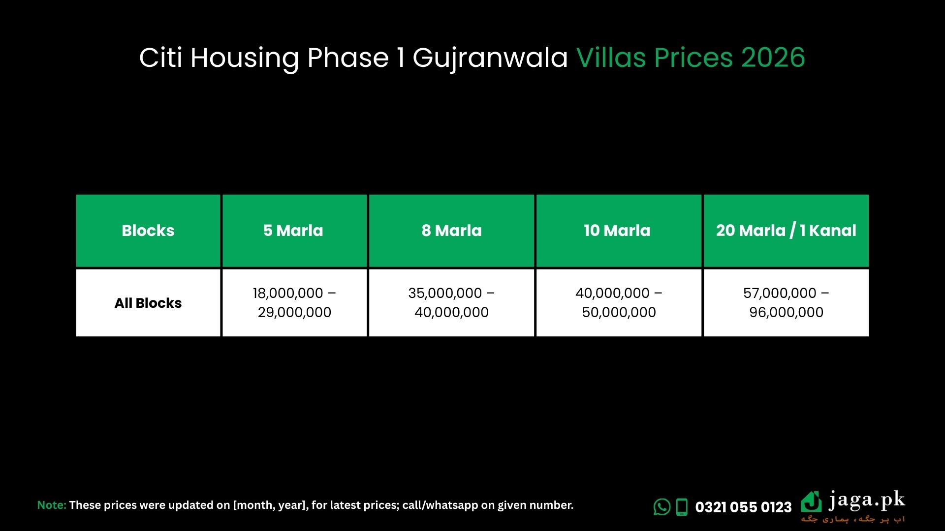 | Blocks | 5 Marla (PKR) | 8 Marla (PKR) | 10 Marla (PKR) | 20 Marla / 1 Kanal (PKR) |
