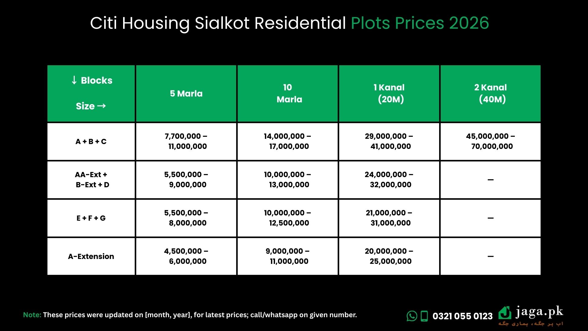 | Blocks | 5 Marla (PKR) | 10 Marla (PKR) | 1 Kanal (20M) (PKR) | 2 Kanal (40M) (PKR) |