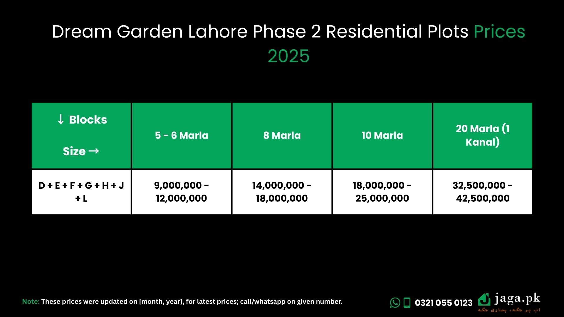 Dream Garden offers distinct investment profiles across its phases. Phase 1 plots command a high premium (5 Marla up to 14 million PKR) for immediate possession, while Phase 2 offers a lower entry barrier with plots available on a 3-year installment plan (5 Marla plots starting at 9 million PKR).