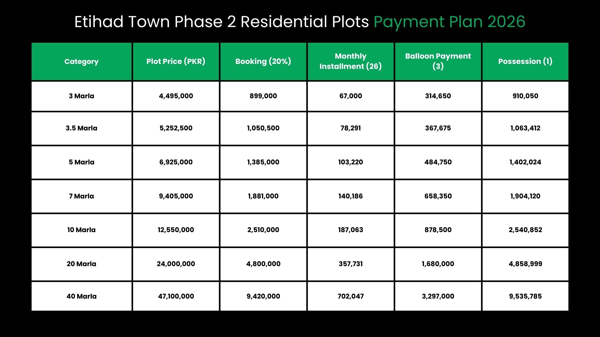 | Category | Plot Price (PKR) | Booking (20%) | Monthly Installment (26) | Balloon Payment (3) | Possession (1) |