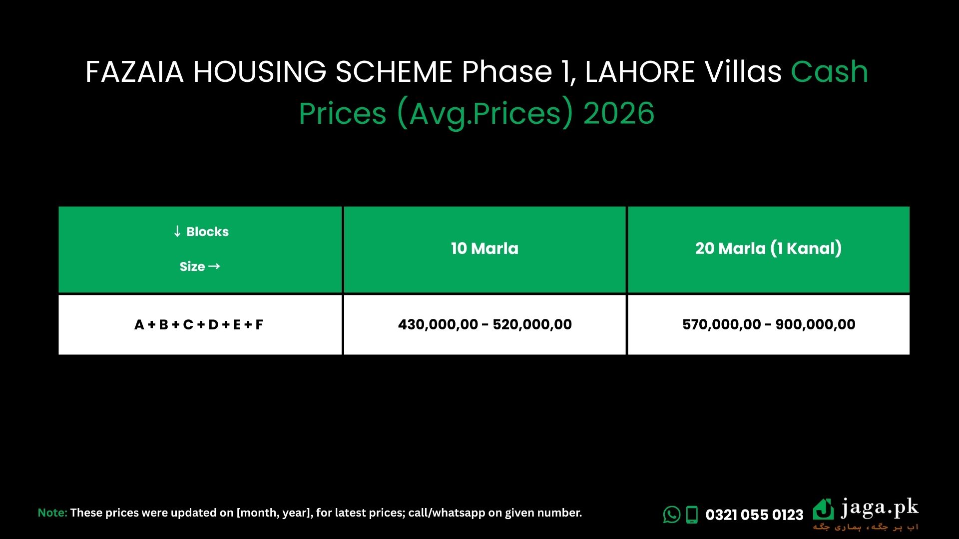FAZAIA HOUSING SCHEME Phase 1, LAHORE Villas Cash Prices (Avg. Prices) 2026