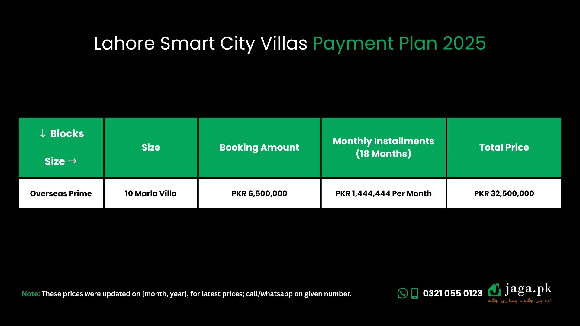 | Overseas Prime | 10 Marla Villa | PKR 6,500,000 | PKR 1,444,444 | PKR 32,500,000 |