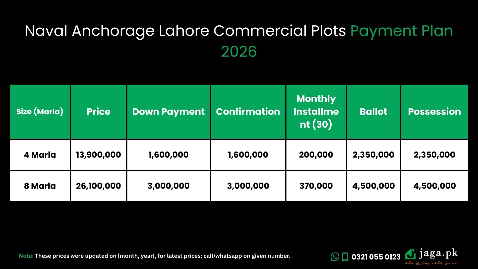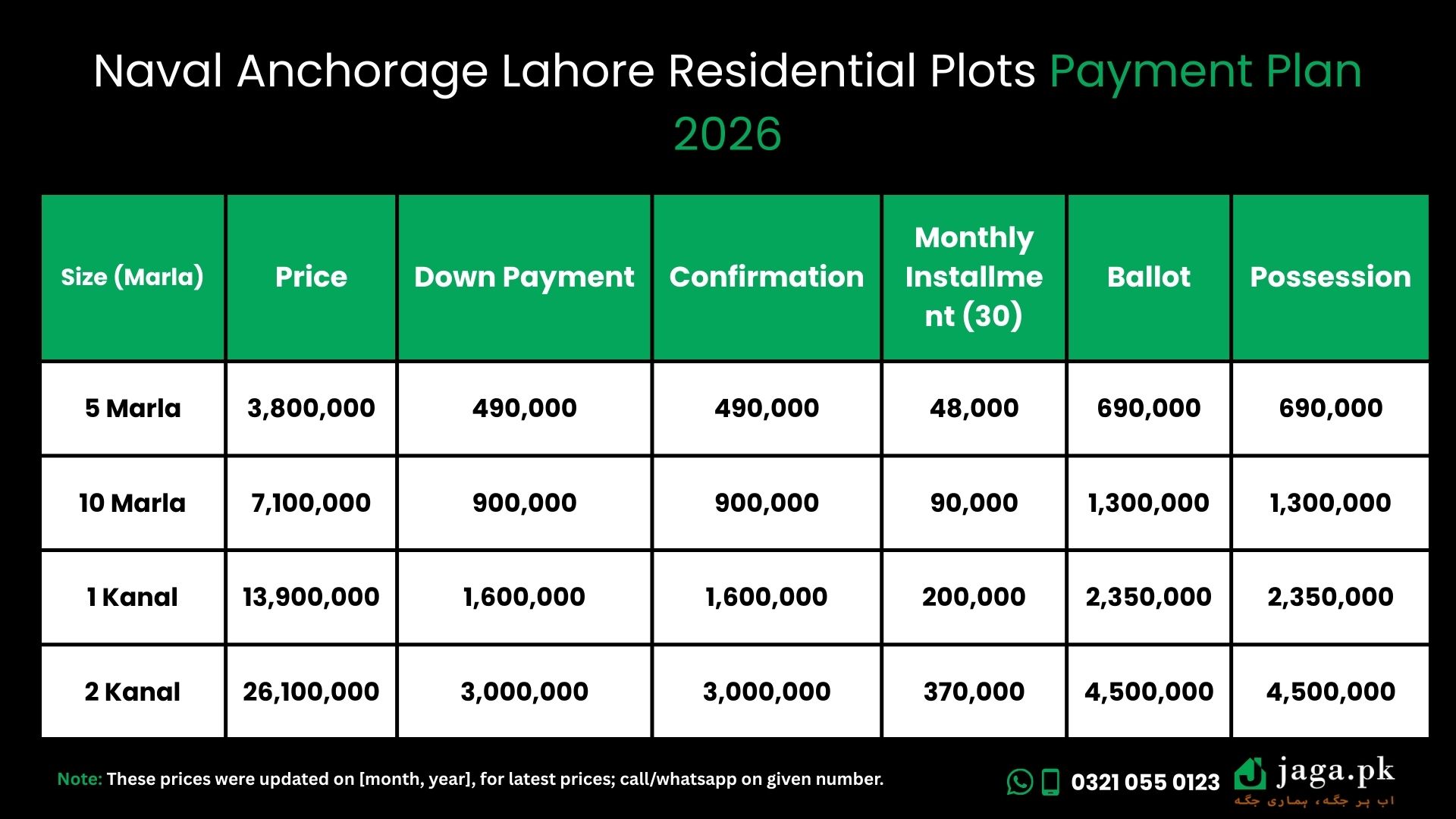 | Size (Marla) | Total Price (PKR) | Down Payment (PKR) | Confirmation (PKR) | Monthly Installment (30) (PKR) | At Ballot (PKR) | At Possession (PKR) |