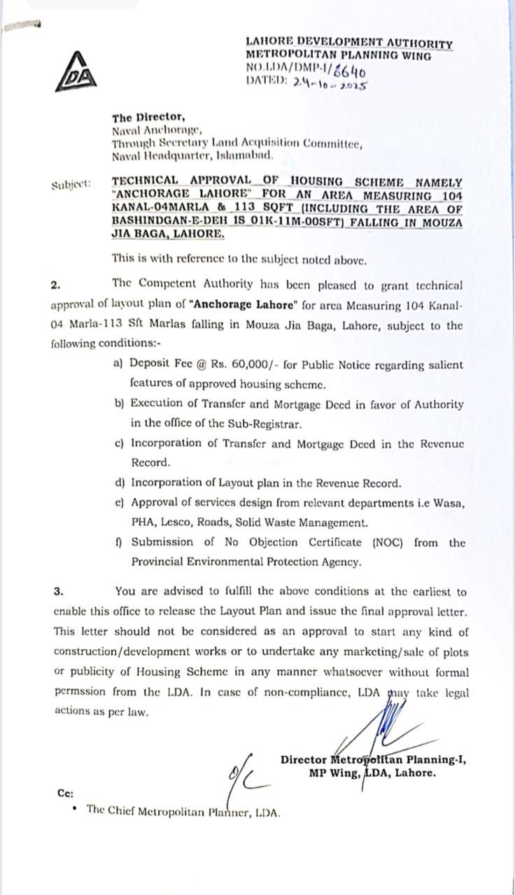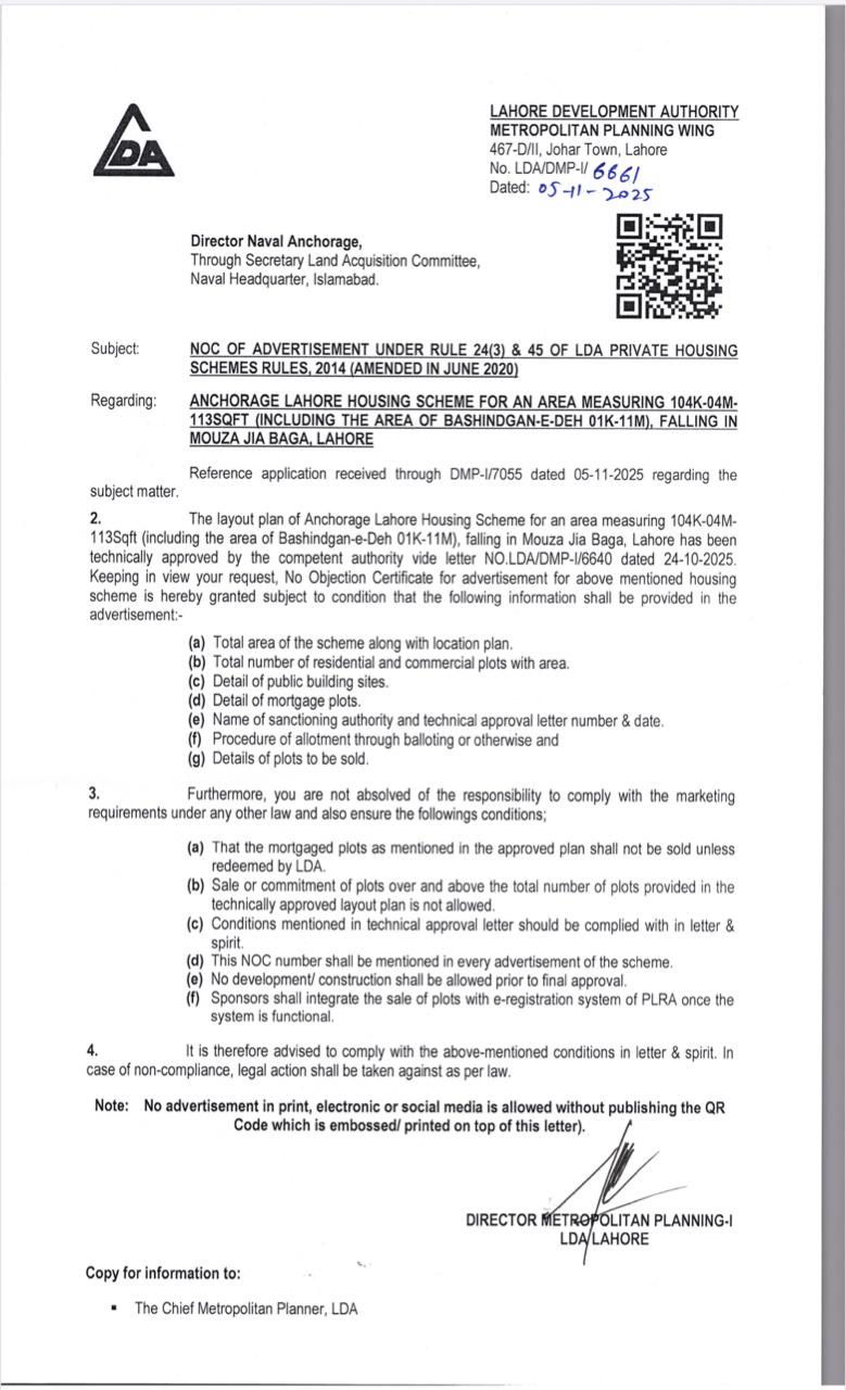 Naval Anchorage Lahore is a LDA-approved housing scheme, ensuring its legal status and compliance with the development regulations of the Lahore Development Authority. The project has obtained formal approval from LDA, which confirms that its master plan, land use, and development framework meet the required urban planning standards.