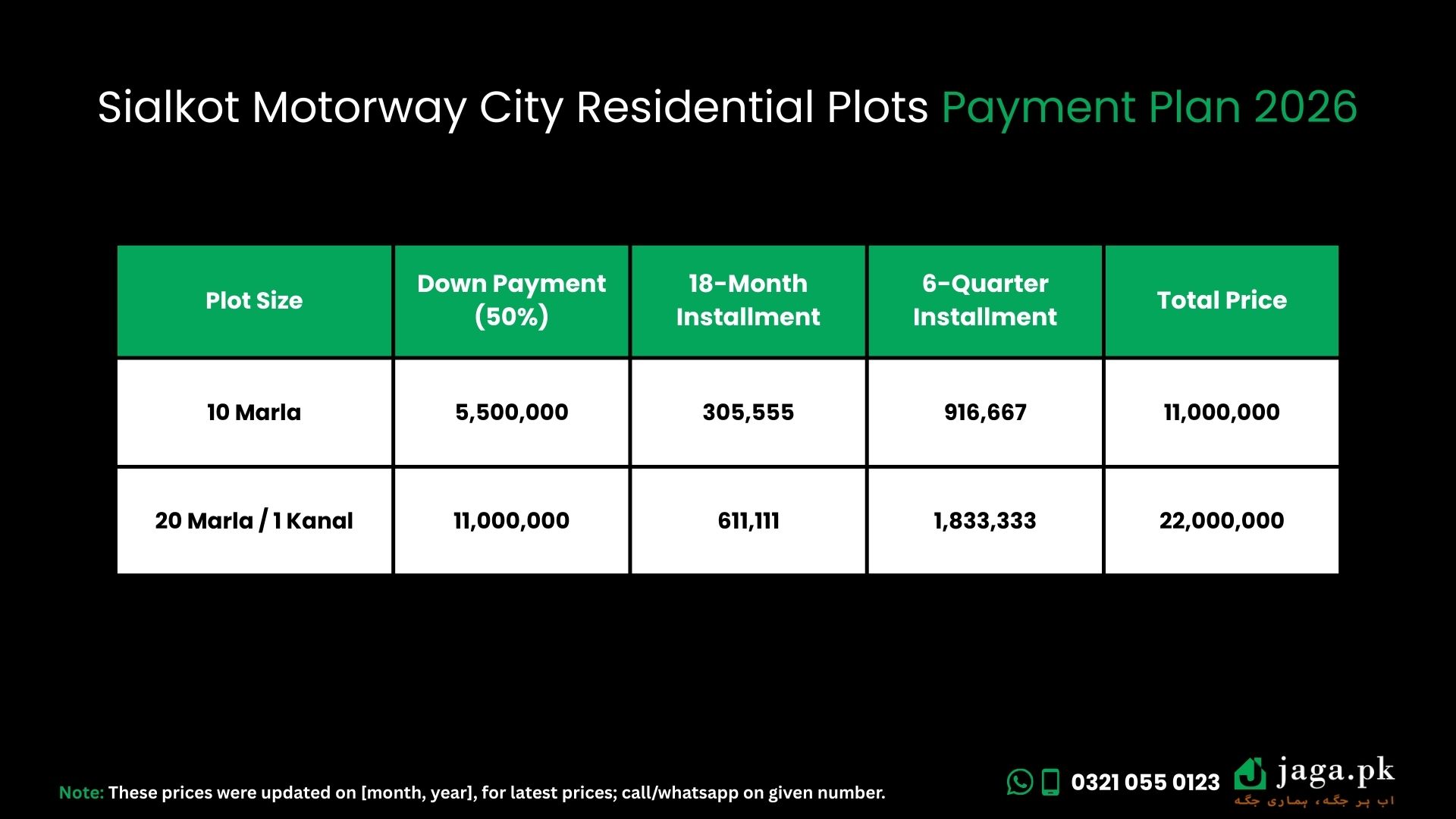 Sialkot Motorway City offers both a structured installment journey for larger plots and competitive cash-only deals for smaller residential units.