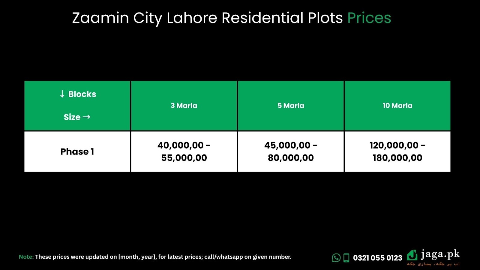 The pricing in Zaamin City Lahore, particularly for Phase 1, indicates a high-demand, high-growth area. The prices for 5 Marla plots range widely from 4.5 million PKR to 8 million PKR, reflecting the premium associated with plot location (main boulevard, park facing, or standard interior).