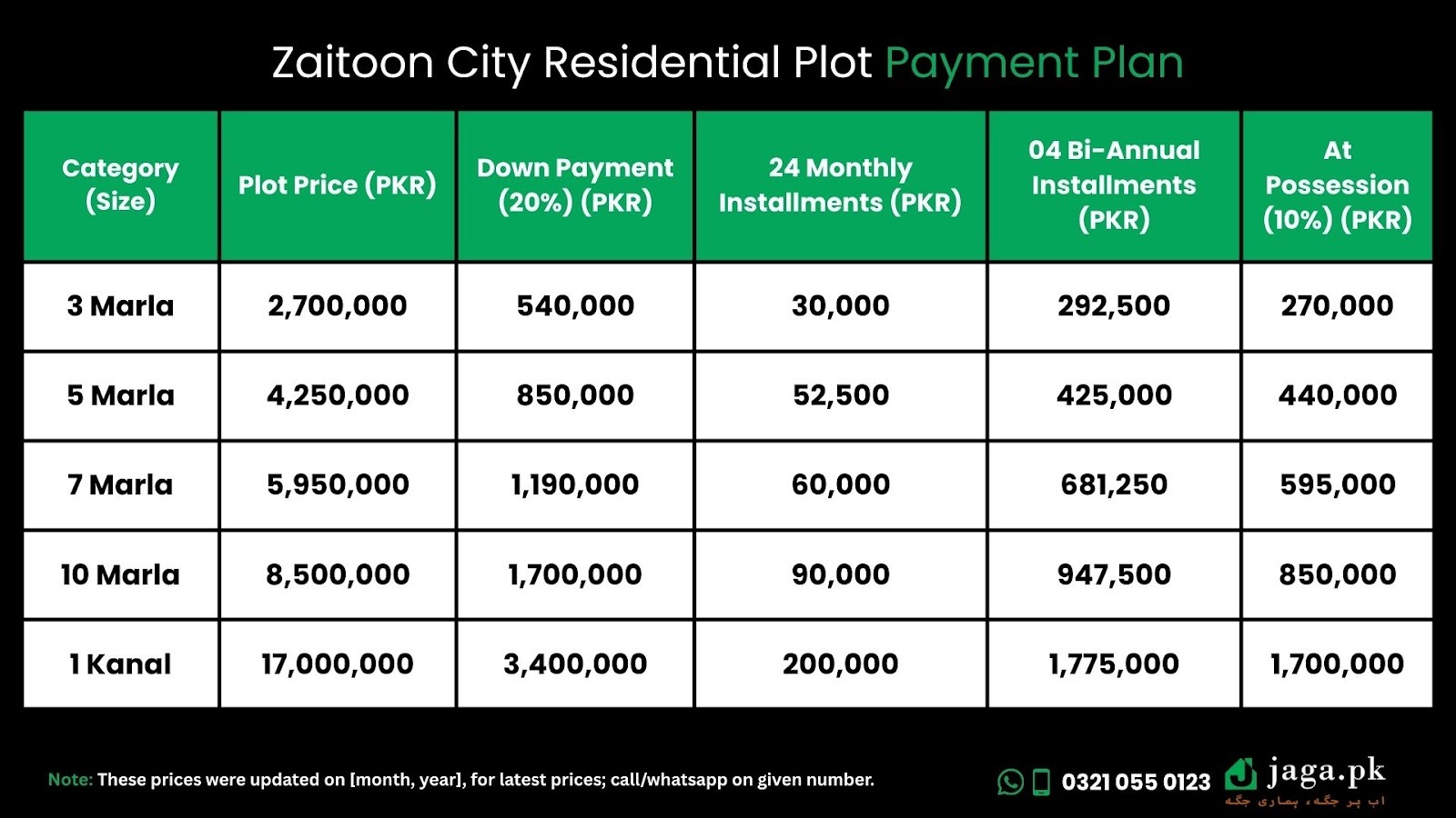 Zaitoon City offers flexible payment schedules, with the longest installment plan spanning 42 months (3.5 years)—particularly for larger categories such as 20 Marla plots.