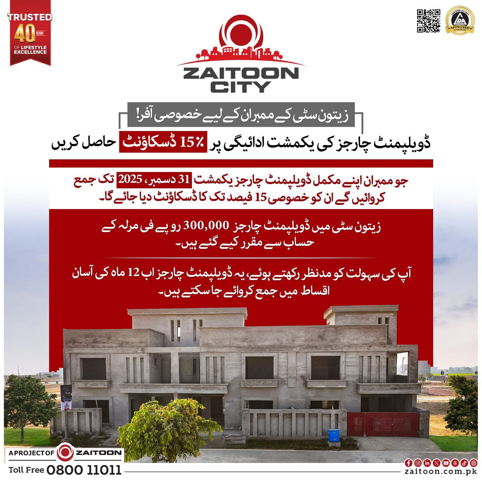 Zaitoon City has announced a 15% discount on full lump-sum payment of development charges for members who clear their dues by 31 December 2025.